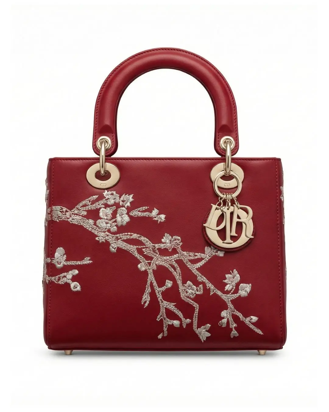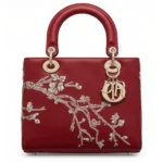 Dior Cherry Blossom Lady Dior Bag crafted in red leather with delicate cherry blossom embroidery and gold-tone Dior hardware. This limited edition Lady Dior design highlights Dior’s tradition of combining refined craftsmanship with artistic detail.
