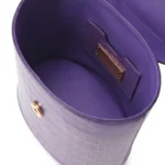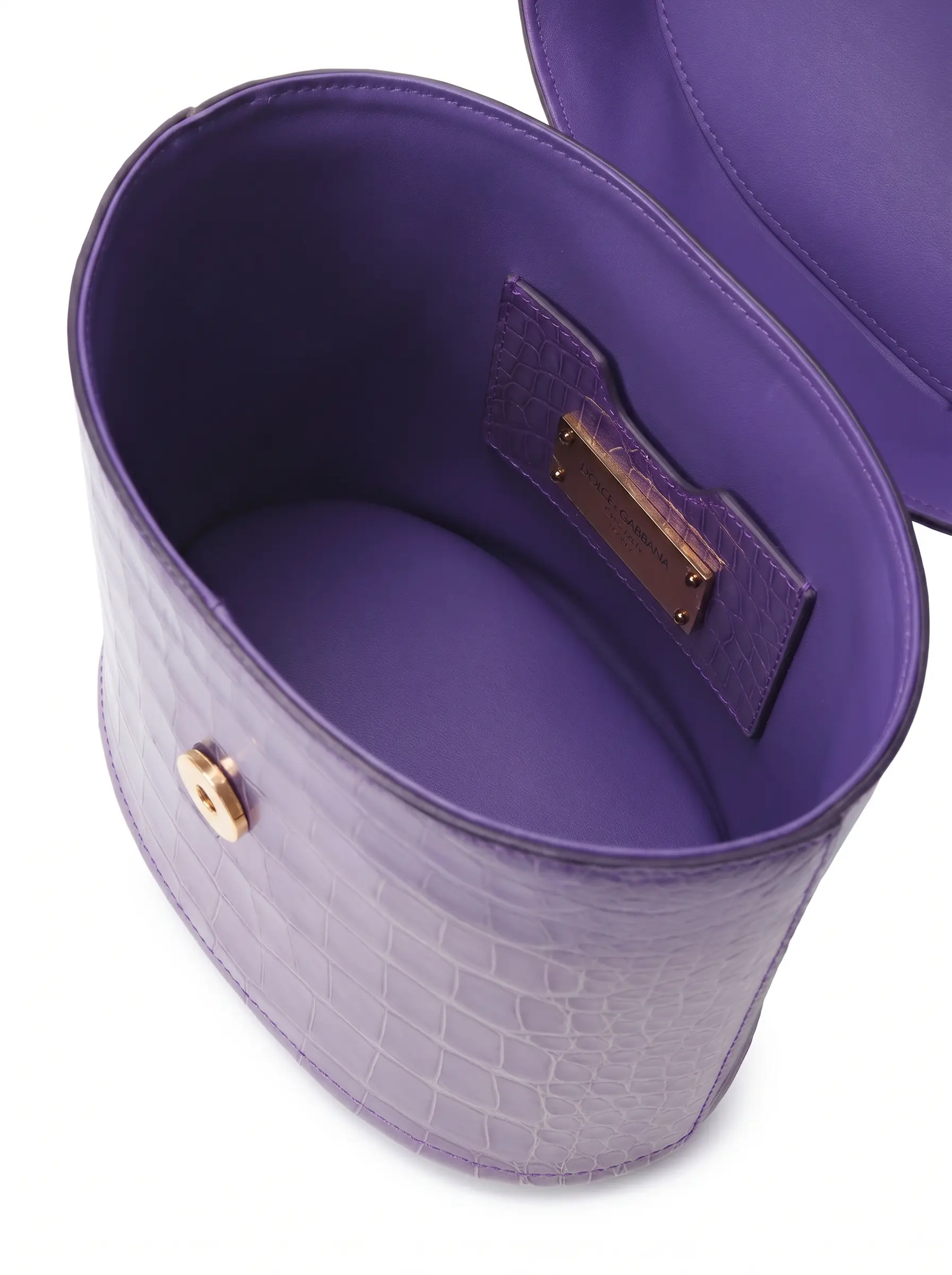 Rendered in refined alligator leather, the surface reveals a precise, structured texture enhanced by a soft, luminous finish in a delicate lilac tone. The cylindrical silhouette introduces a sculptural dimension, contrasting with the intricate Devotion heart emblem—adorned with finely set stones and gold-tone accents—positioned at the center.