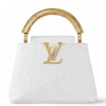 Louis Vuitton Capucines Ostrich Bag crafted in white ostrich leather with signature LV hardware and elegant gold-tone handle. The Capucines design is one of Louis Vuitton’s most refined handbag silhouettes, known for its structured shape and timeless elegance.
