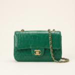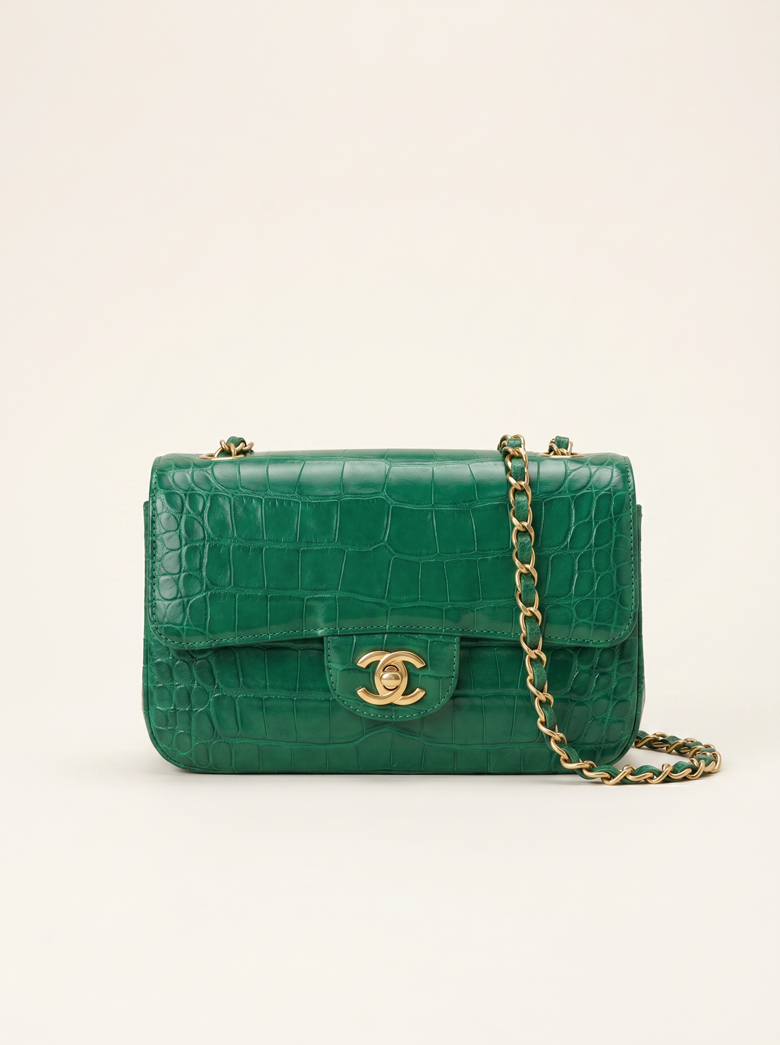 Crafted from exceptional crocodile leather, the surface reveals a precise, natural pattern enhanced by a subtle sheen that elevates its rich green tone. The softly structured flap silhouette is complemented by the signature interlocking CC closure and a delicate chain strap, maintaining balance between heritage and modernity.
