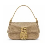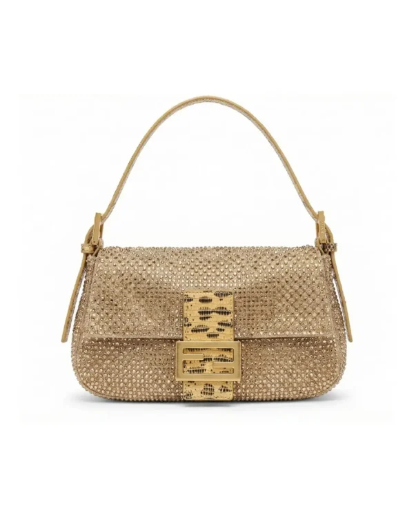 The Fendi Runway Fall Winter 2026 Baguette is presented in an opulent gold crystal-embellished finish, accented with tonal exotic leather trim and signature FF clasp hardware. Revealed during the Fall Winter 2026 runway presentation, this edition exemplifies Fendi’s mastery of surface embellishment and elevated craftsmanship.