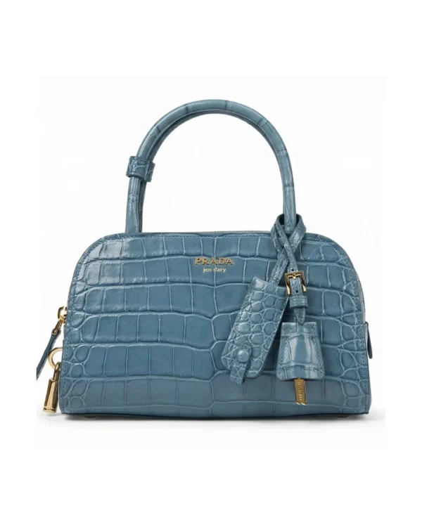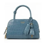 The Prada Runway Fall Winter 2026 Bag is presented in structured crocodile-embossed leather in a refined blue tone, accented with gold-tone hardware and architectural top-handle construction. Revealed during the Fall Winter 2026 runway presentation, this piece reflects Prada’s continued exploration of precision tailoring translated into handbag form.