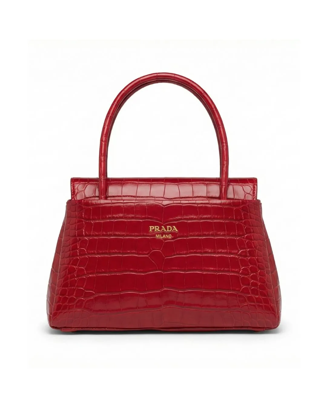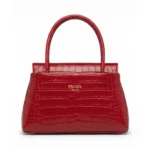 The Prada Runway Fall Winter 2026 Crocodile Bag is presented in striking red crocodile leather with gold-tone Prada Milano hardware. Unveiled during the Fall Winter 2026 runway presentation, this structured top-handle silhouette reflects Prada’s architectural approach to modern luxury.